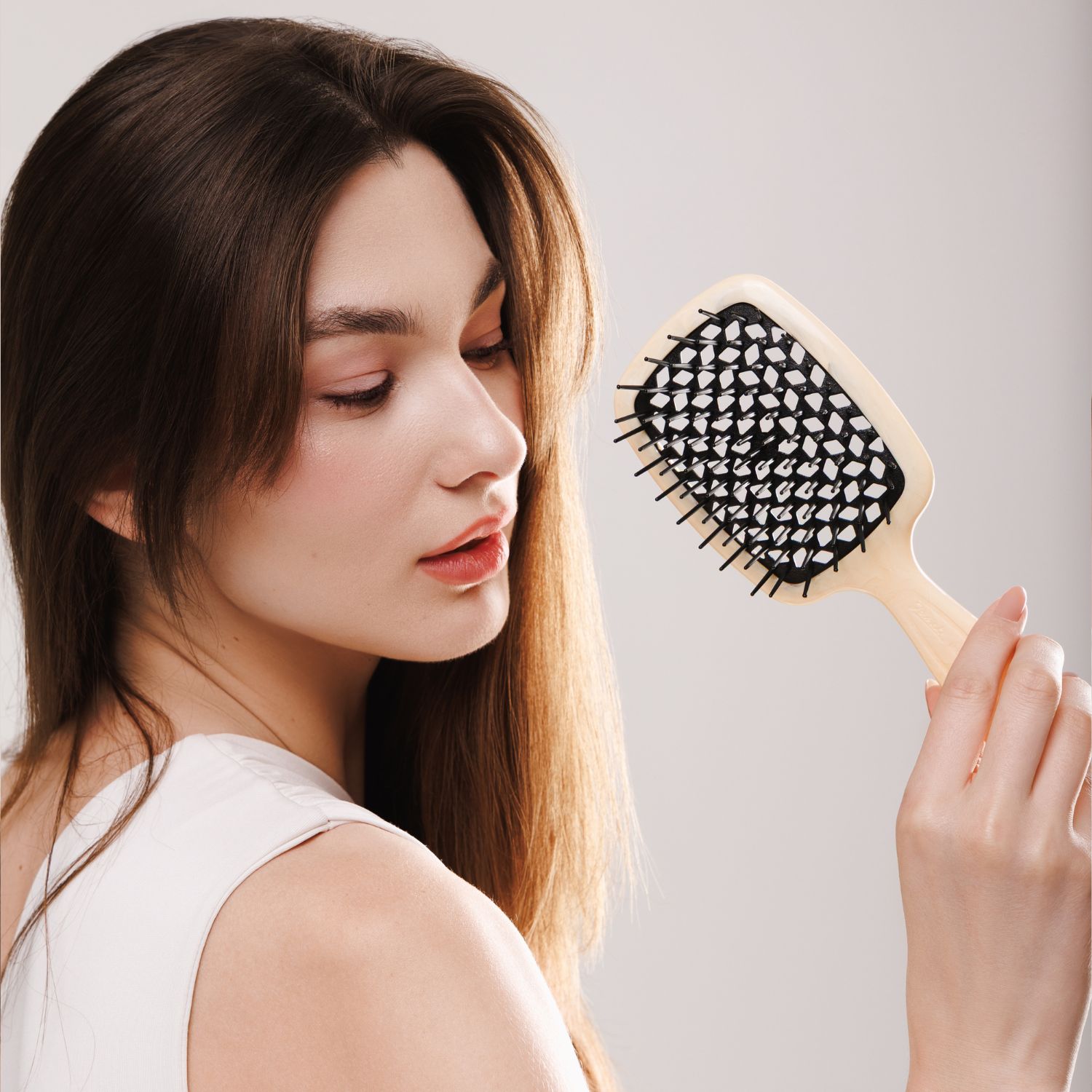 Массажная база щётки состоит из запатентованного изобретения, которое представляет собой основание с отверстиями в форме пчелиного улья. Горячий воздух фена распределяется настолько равномерно, что не травмирует кожу головы, не иссушает локоны и волосы высушены за несколько мгновений без всякого вреда.